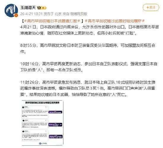 11 时 26 分,高市早苗紧急发布消息,就日本陆上自卫队 10 式坦克训练时发生弹药爆炸事故深表遗憾。爆炸导致自卫队员 3 死 1 伤。高市早苗口口声声说 " 人很重要 ",结果她吹嘘的日本武器,恰恰导致了她所在意的 " 人 " 死亡。