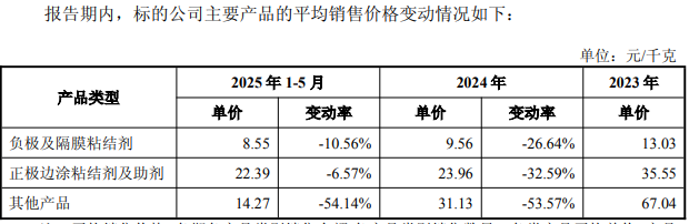 据披露,2023年、2024年及2025年1-5月,茵地乐向璞泰来、宁德时代、蜂巢能源、中创新航、比亚迪等前五大客户的合计销售额占比分别为61.11%、63.75%及62.9%。这期间,公司主要产品价格持续走低,2024年、2025年前五个月,负极及隔膜粘结剂单价分别下滑26.64%、10.56%,正极边涂粘结剂及助剂单价分别降低32.59%、6.57%,其他产品也分别跌了53.57%、54.14%。