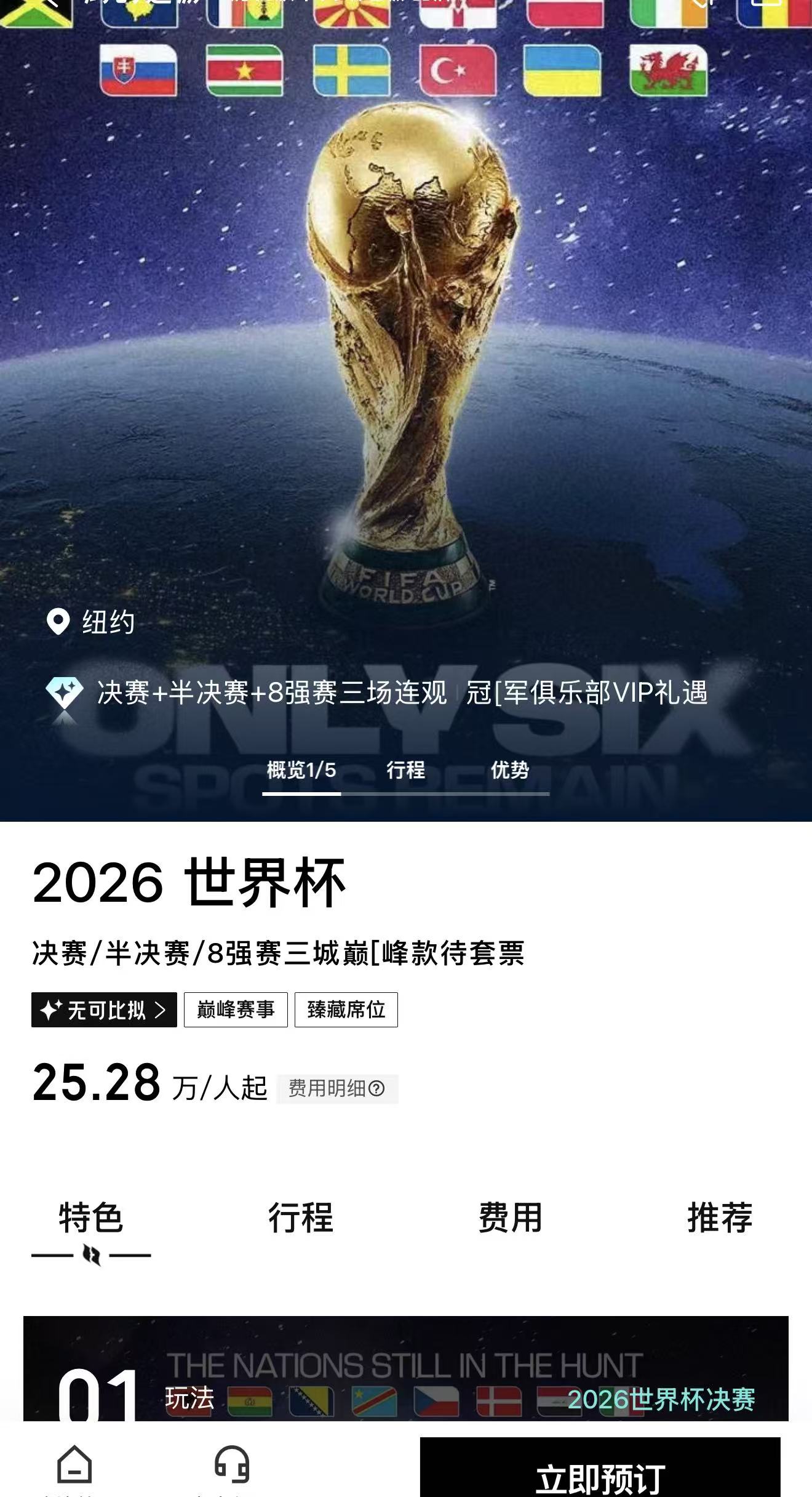 在第三方平台携程,一家做高端定制游的企业,推出2026世界杯决赛/半决赛/8强赛三城巅峰款待套票,售价252800/人起。店铺管家告诉界面新闻记者,这套产品包含决赛+一场半决赛+一场8强赛在内的三张门票,“2026美加墨世界杯决赛FIFA Pavilion营帐款待票代订1张,2026美加墨世界杯达拉斯半决赛Champion club(冠军俱乐部)款待票代订1张,2026美加墨世界杯洛杉矶8强赛Champion club(冠军俱乐部)款待票代订1张。”管家对界面新闻表示,该行程从洛杉矶到达拉斯、纽约,共计10天。