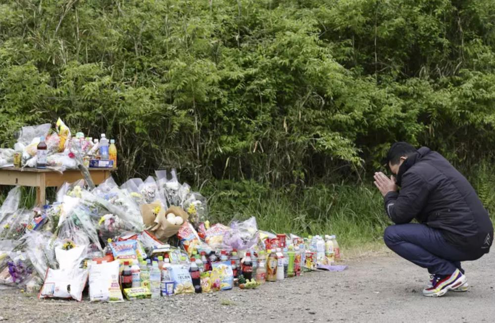 · 在发现结希遗体的地点附近,民众自发搭起了献花台。(日本共同社)