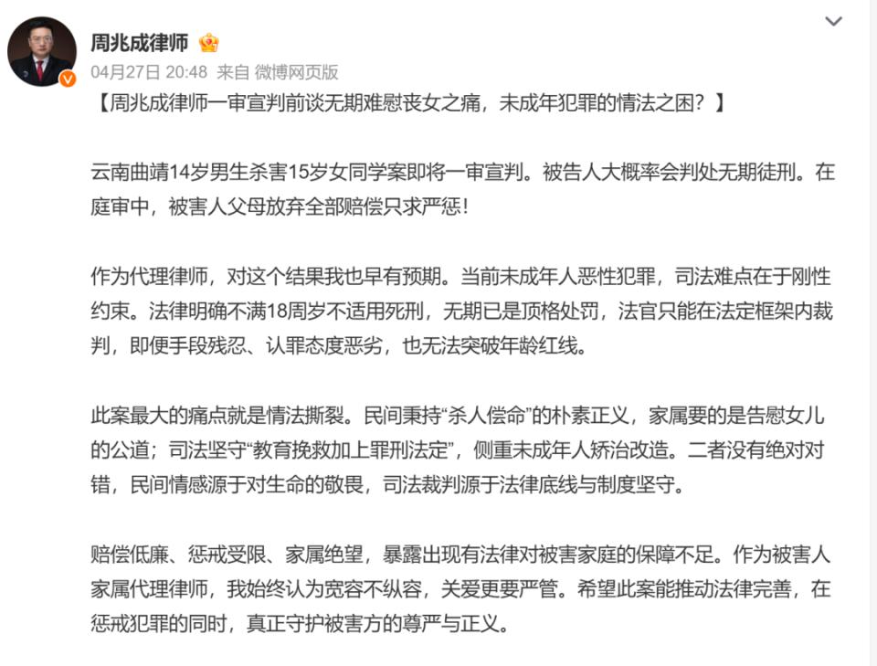 本案受害方的代理律师周兆成律师表示,判处无期已是现行法律框架下对未成年罪犯的顶格处罚和最重惩戒。