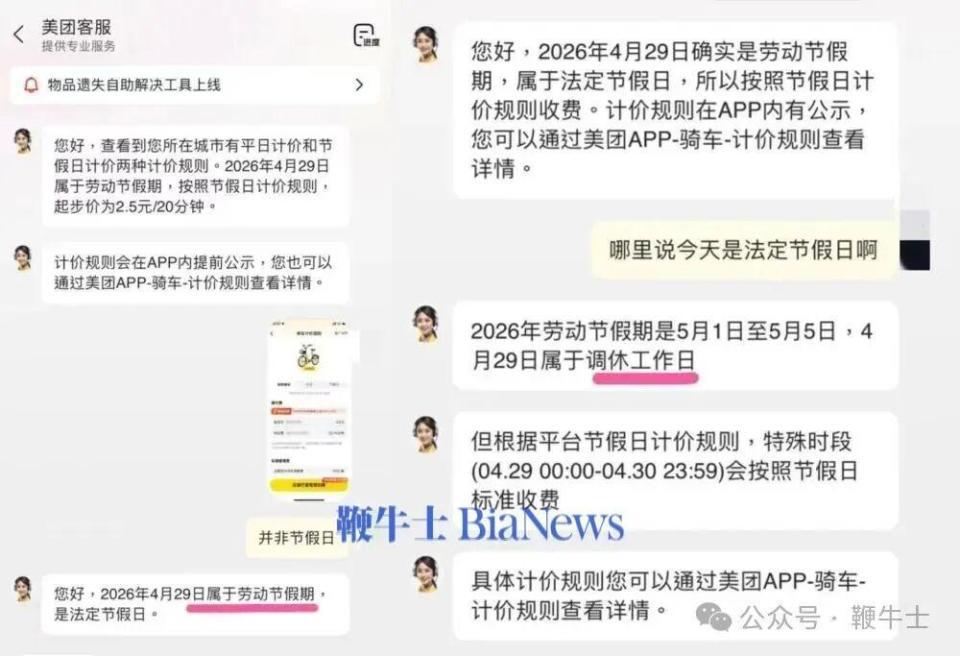 同时,该网友在与美团 ai 客服 " 小美 " 沟通时,该用户发现平台对 " 特殊期间 " 的定义前后矛盾。ai 客服最初称 4 月 29 日属于劳动节法定节假日,应按节假日计价;被用户指出该日并非法定节假日后,又改口称其为 " 调休工作日 ",但根据 2026 年劳动节放假安排,4 月 29 日至 30 日并非调休工作日。