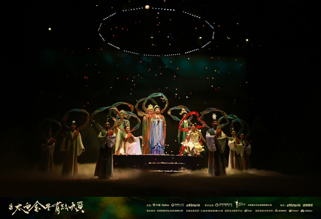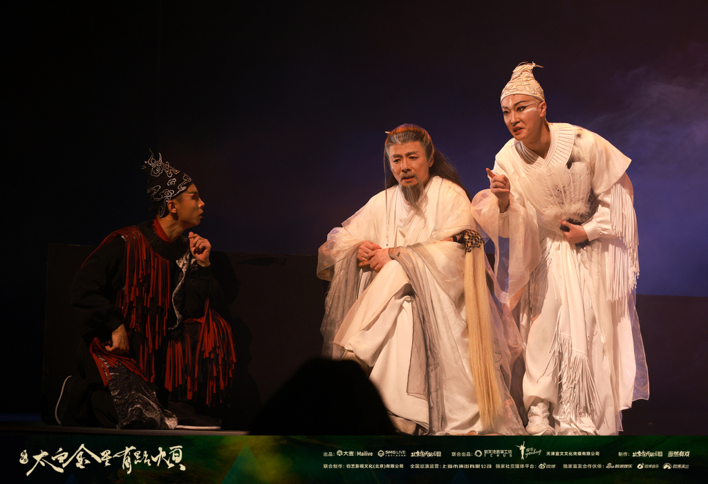 有了小说的坚实打底,舞台之上,西天取经庆功大会跃然纸上:众神合唱的主题曲《敢问路在何方》响彻云霄,负责取经全程劫难设计的功臣——太白金星李长庚却置身会场之外,在飘散的歌声中渐渐意兴阑珊,他的正念和浊念元婴一左一右伴在身边,与他“复盘”唐僧师徒四人取经时,自己数次被谈话的经历。在此过程中,观音、文殊普贤、黎山老母、哪吒、地官大帝等悉数登场,交织着无数因果和六耳猕猴的一条命,描摹出了似是而非的“真相”……