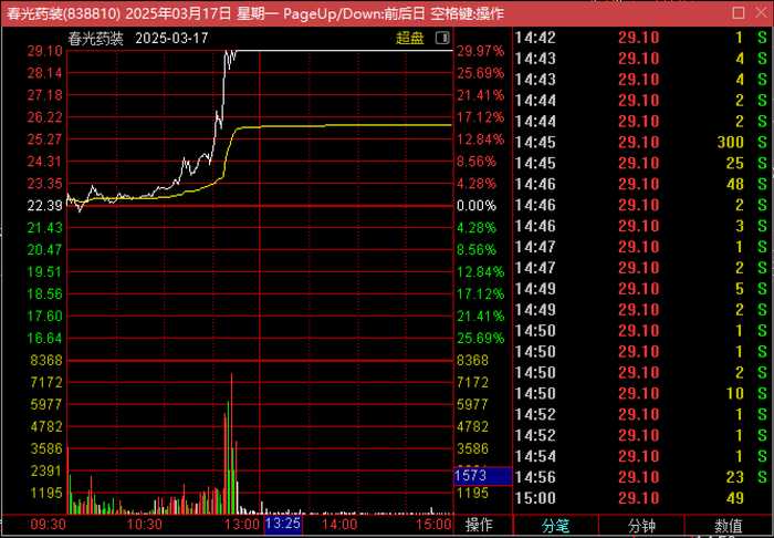 具体来看,该产品相关账户在11:06:43.58至11:08:30.06期间以26.26元/股至29.08元/股的价格买入成交春光药装30.70万股、860.11万元,期间买入成交占比达40.13%。