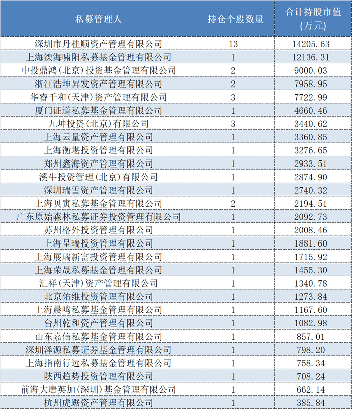 其他私募在北交所个股方面亦有所布局。Wind数据显示,截至2024年三季报时,共有28家私募旗下产品出现在36只北交所个股的前十大流通股东中,合计持仓总市值为9.47亿元。