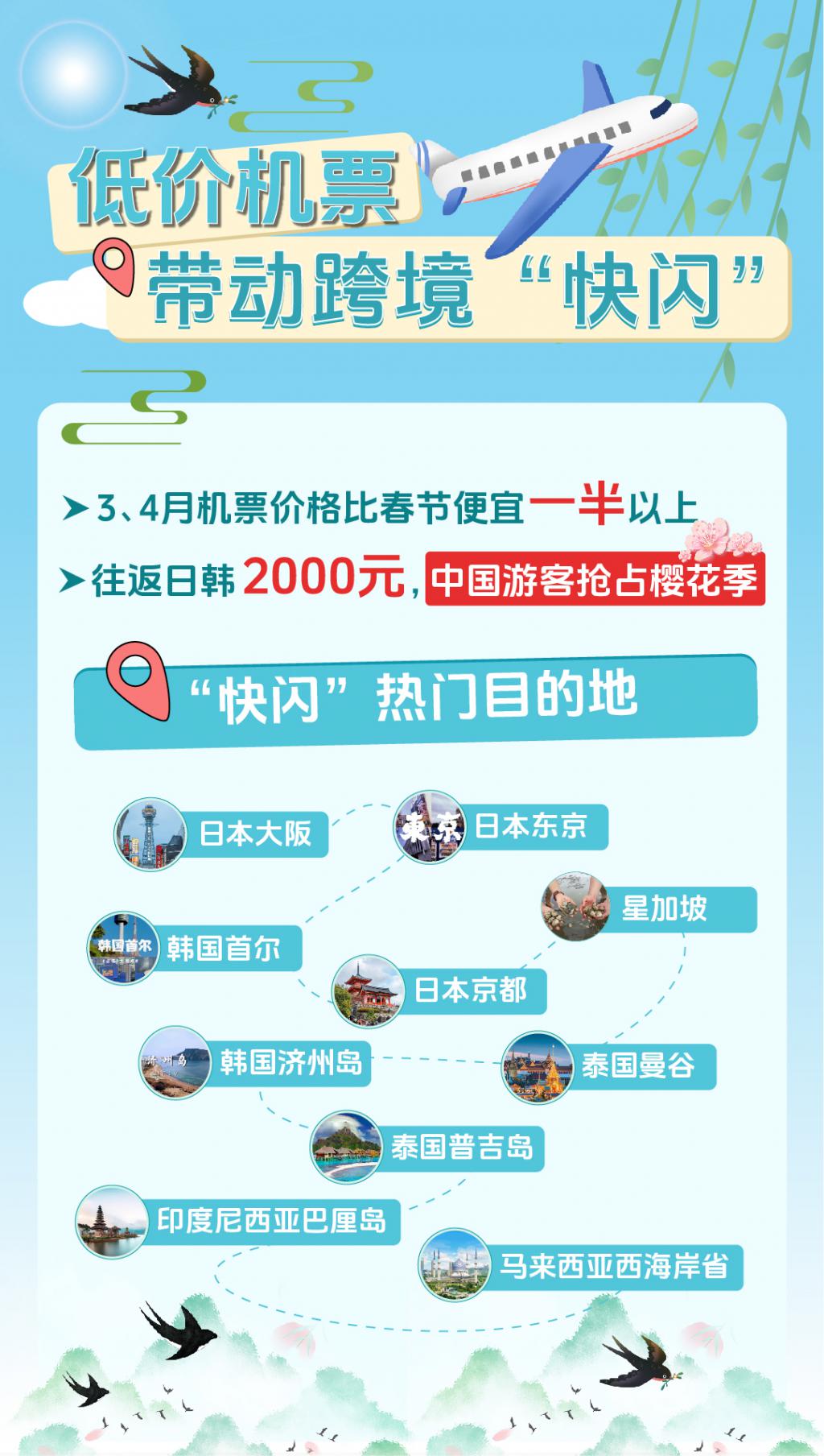 3、4 月本是旅游淡季,机票、酒店价格较春节、五一低一半以上,相当于打五折。便宜的机票价格,让许多游客选择拼假前往日本、韩国或东南亚地区,来一场 " 快闪 " 踏春。