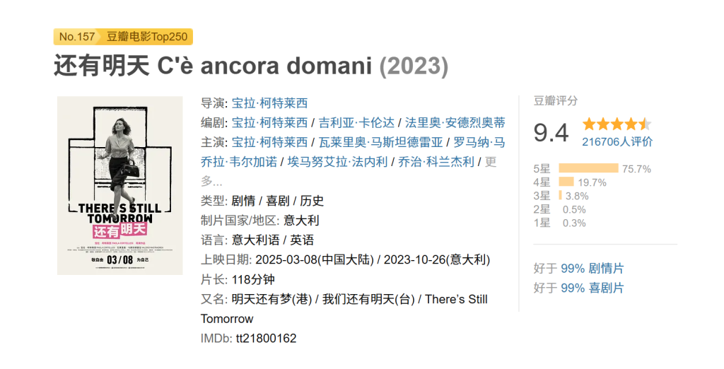 自妇女节当日在国内上映后,电影《还有明天》的豆瓣评分一路上涨至9.4分,上映第十天,它进入“豆瓣电影Top250”榜单,这是豆瓣最重要的榜单之一,有150万人关注。在各大平台上,观众自发分享的观影感受也热度不减。实际上,2023年这部电影就在意大利击败了火爆全球的《芭比》和《奥本海默》,获得了票房冠军。