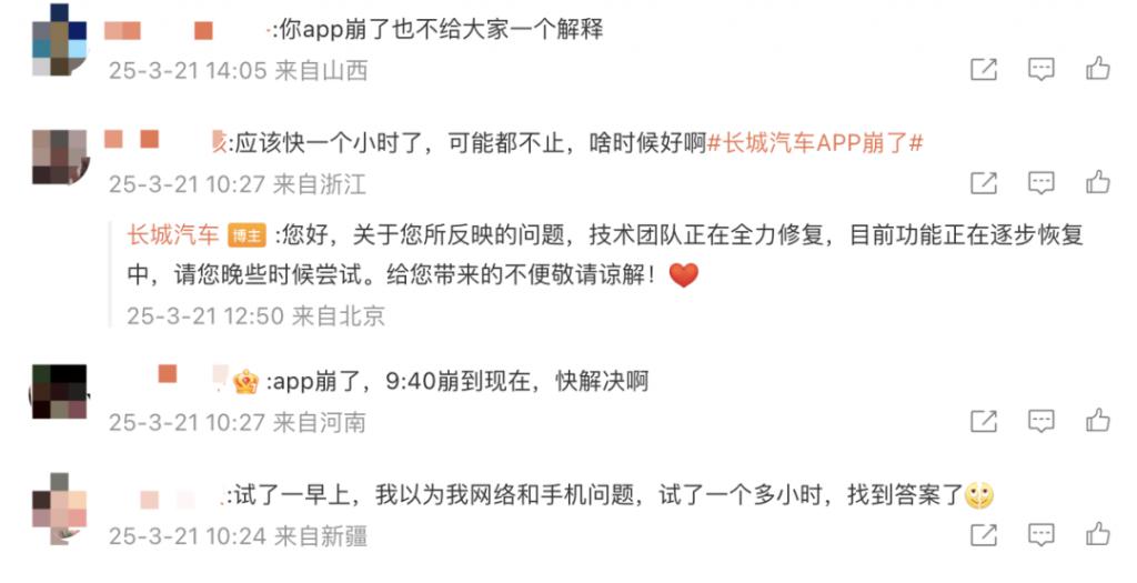 在长城汽车官方微博下,也有不少网友提到 "App 崩了 "。在长城汽车官微评论区,也有不少网友提到长城旗下的坦克、魏牌的 APP 也崩了。