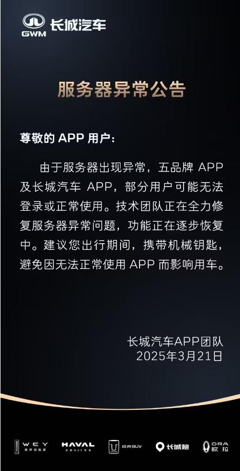 21 日午间,长城汽车发布服务器异常公告。公告称,由于服务器出现异常,五品牌 App 及长城汽车 App,部分用户可能无法登录或正常使用。长城汽车表示,技术团队正在全力修复服务器异常问题,功能正在逐步恢复中。建议车主出行期间,携带机械钥匙,避免因无法正常使用 App 而影响用车。