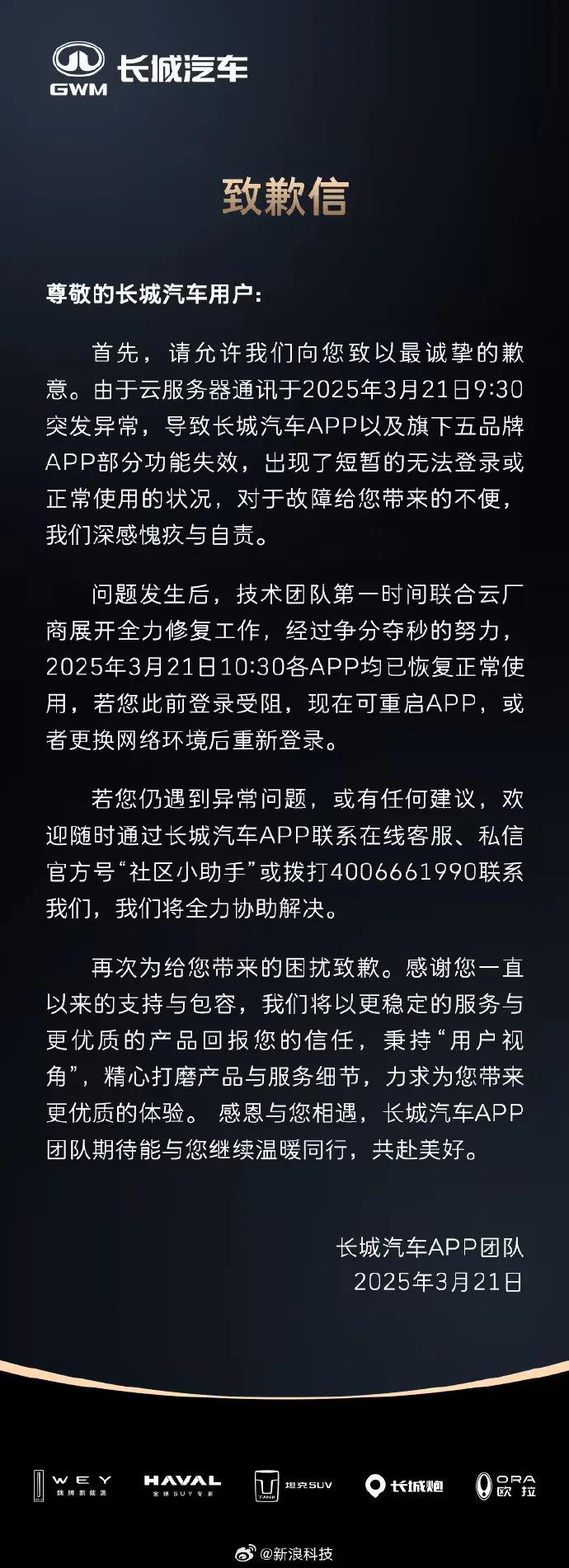 长城汽车今日发布致歉信:" 由于云服务器通讯于 2025 年 3 月 21 日 9:30 突发异常,导致长城汽车 App 以及旗下五品牌 App 部分功能失效,出现了短暂的无法登录或正常使用的状况,对于故障给您带来的不便我们深感愧疚与自责。" 长城汽车称,问题发生后,技术团队第一时间联合云厂商展开全力修复工作,经过争分夺秒的努力,2025 年 3 月 21 日 10:30 各 App 均已恢复正常使用,若您此前登录受阻,现在可重启 App,或者更换网络环境后重新登录。