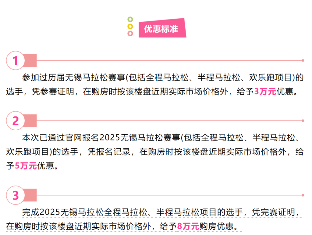 参加过历届无锡马拉松赛事(包括全程马拉松、半程马拉松、欢乐跑项目)的选手,凭参赛证明,在购房时按该楼盘近期实际市场价格外,给予3万元优惠。