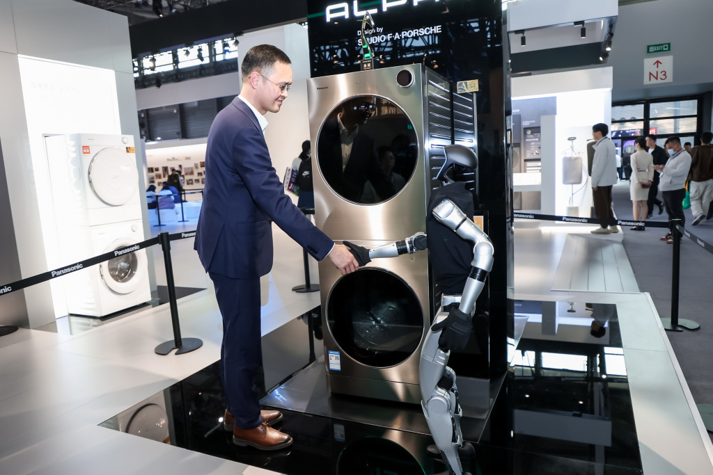 宇树科技机器人也现身松下洗护展台,宇树科技机器人手持α-Watch智控星环(洗衣机操作旋钮)向观众展示。当杭州松下家用电器有限公司总经理胡杰华来到展台时,宇树科技机器人主动 “伸出手”,与胡杰华握手互动。