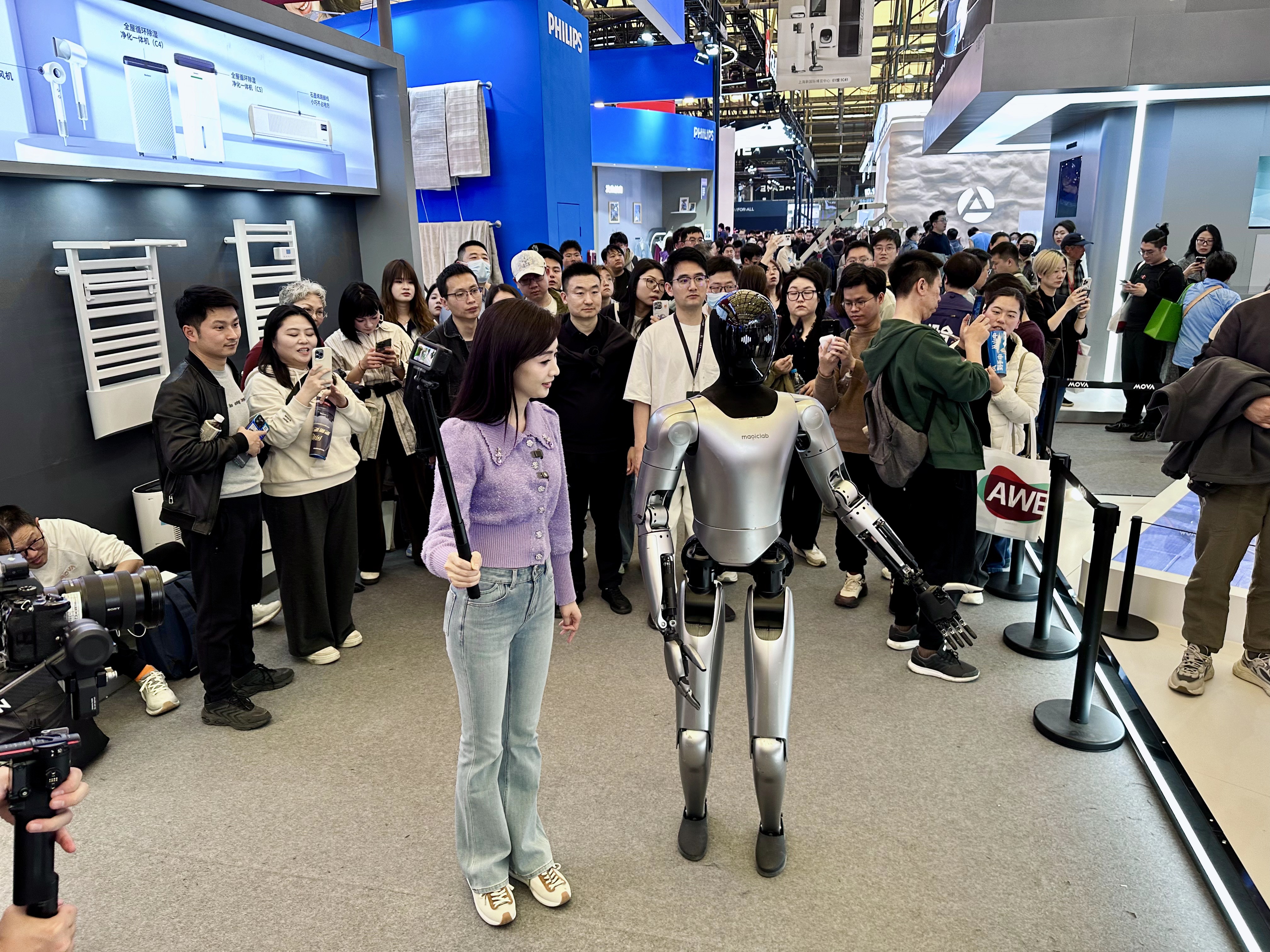 AWE作为全球三大科技展会之一,前沿的技术和创新的产品必不可少,人形机器人、陪伴机器人以及各类家电机器人都出现在展区。