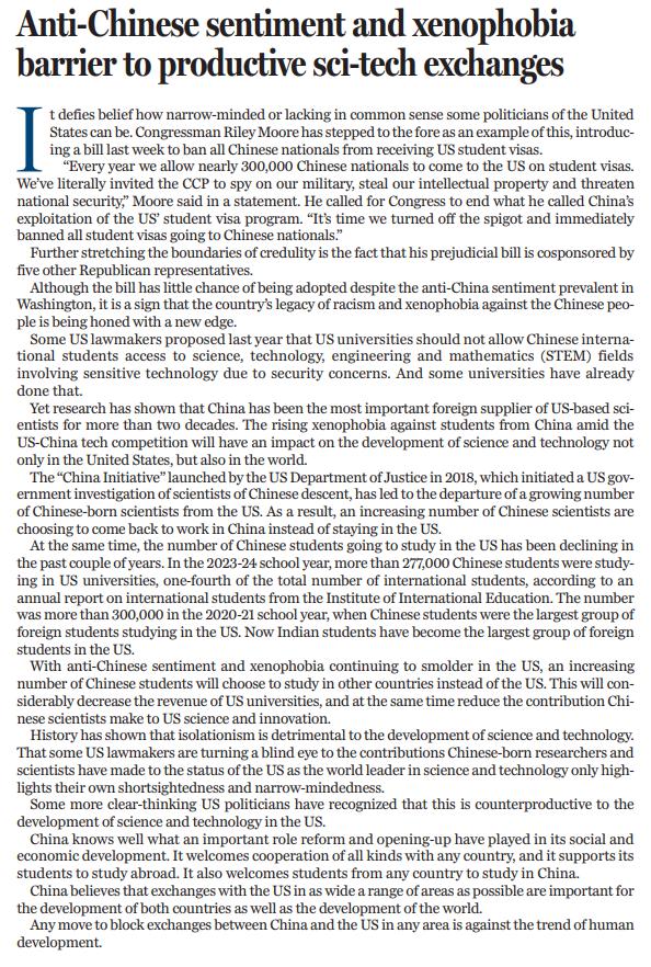 穆尔声称:" 每年我们允许近 30 万中国公民持学生签证来到美国,相当于主动让中国来监视我们的军队、窃取我们的知识产权并威胁美国国家安全。" 他甚至煽动国会,要求 " 立刻关闭阀门,全面禁止向中国学生发放签证 "。令人震惊的是,这一带有强烈偏见的法案还得到了五名共和党议员的支持。