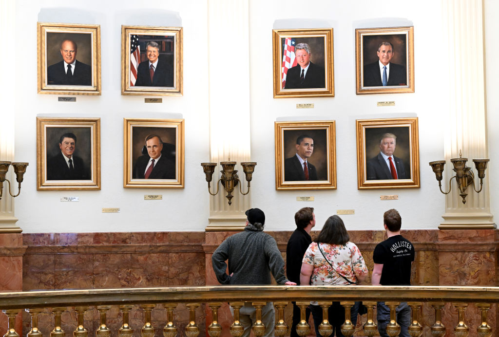 2025年3月24日,游客在科罗拉多州丹佛市的科罗拉多州议会大厦观看美国总统唐纳德·特朗普(右)的肖像。放在特朗普身边的特朗普和前总统巴拉克·奥巴马(Barack Obama)的肖像是由莎拉·a·博德曼(Sarah A. Boardman)绘制的。博德曼在2019年画了特朗普的肖像。(图片来源:Helen H. Richardson/ medinews Group/The Denver Post via Getty Images)海伦·h·理查森/媒体新闻集团/丹佛邮报(通过盖蒂图片社)