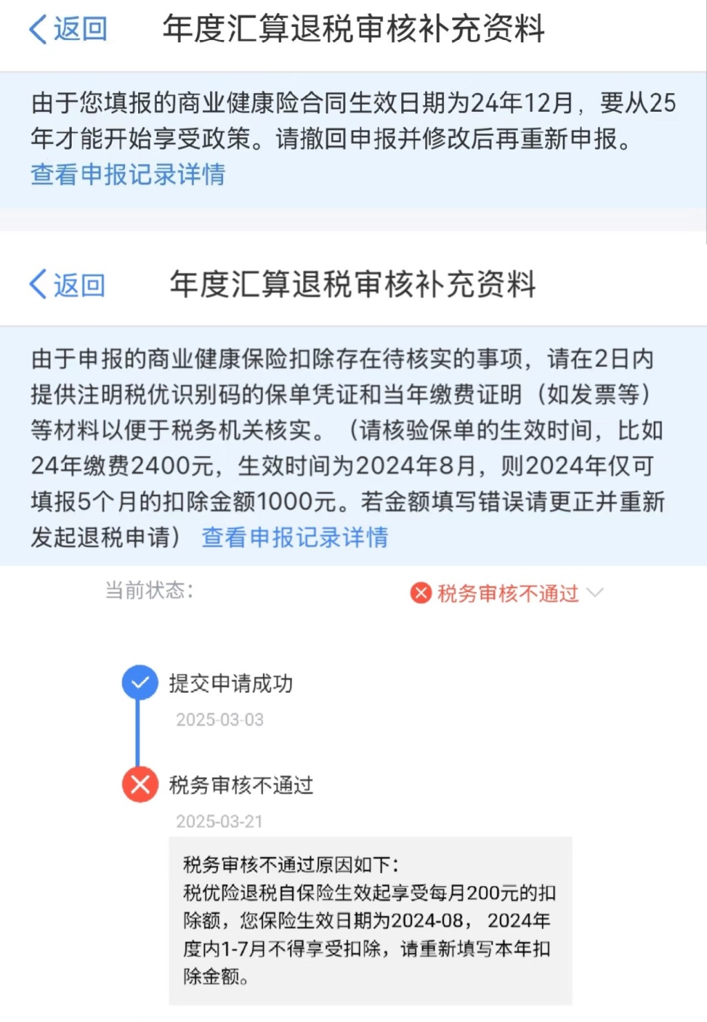 从不少用户的“晒图”中可以发现,不同税务部门对税优健康险个税抵扣的解释有所差异。有税务部门称,由于纳税人填报的商业健康险合同生效日期为2024年12月,要从2025年才能开始享受政策;也有税务部门称,若保单生效时间为2024年8月,则2024年仅可填报5个月的扣税金额1000元,这也就意味着健康险合同生效当月即可享受政策。