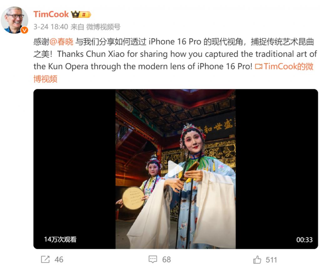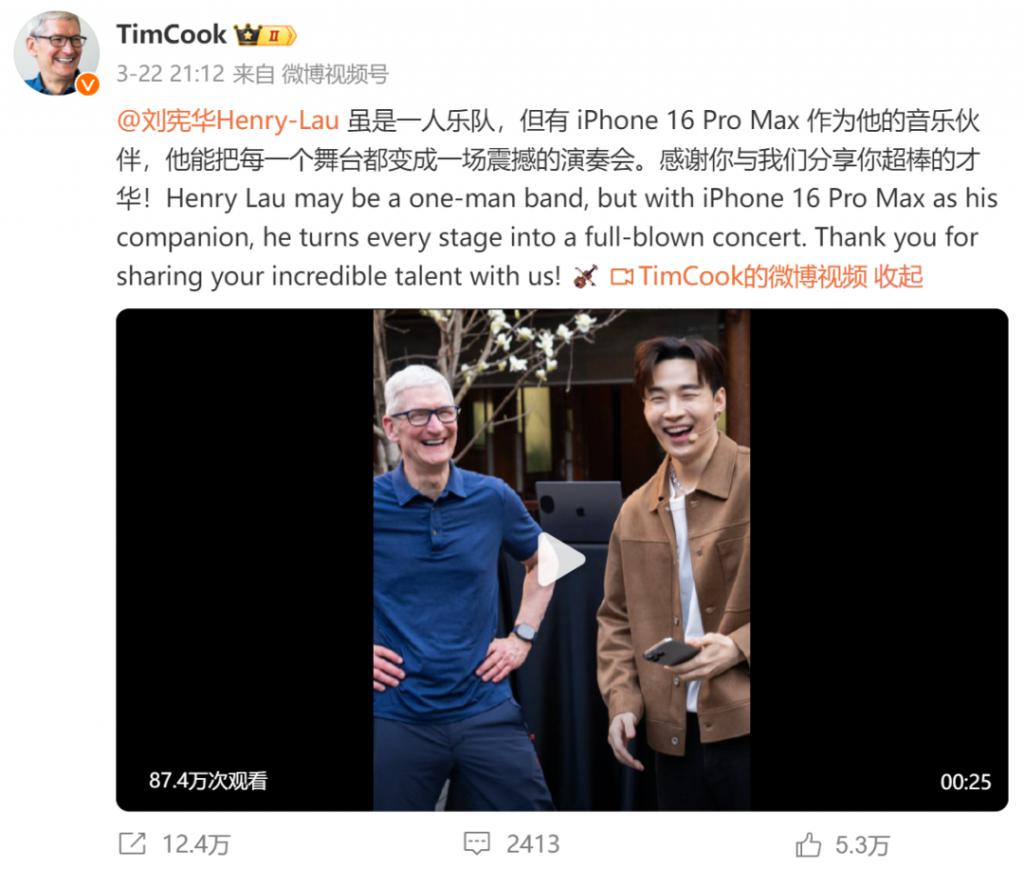 昨日下午,苹果 CEO 库克发布微博:很高兴回到三里屯零售店,与我们超棒的顾客和团队共度时光。