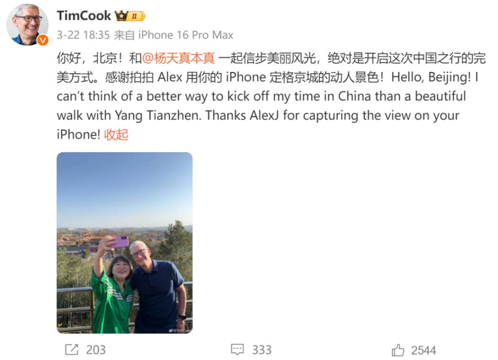 据了解,此次库克中国行,他先是和杨天真逛了景山公园,后参加中国发展高层论坛 2025 年年会。