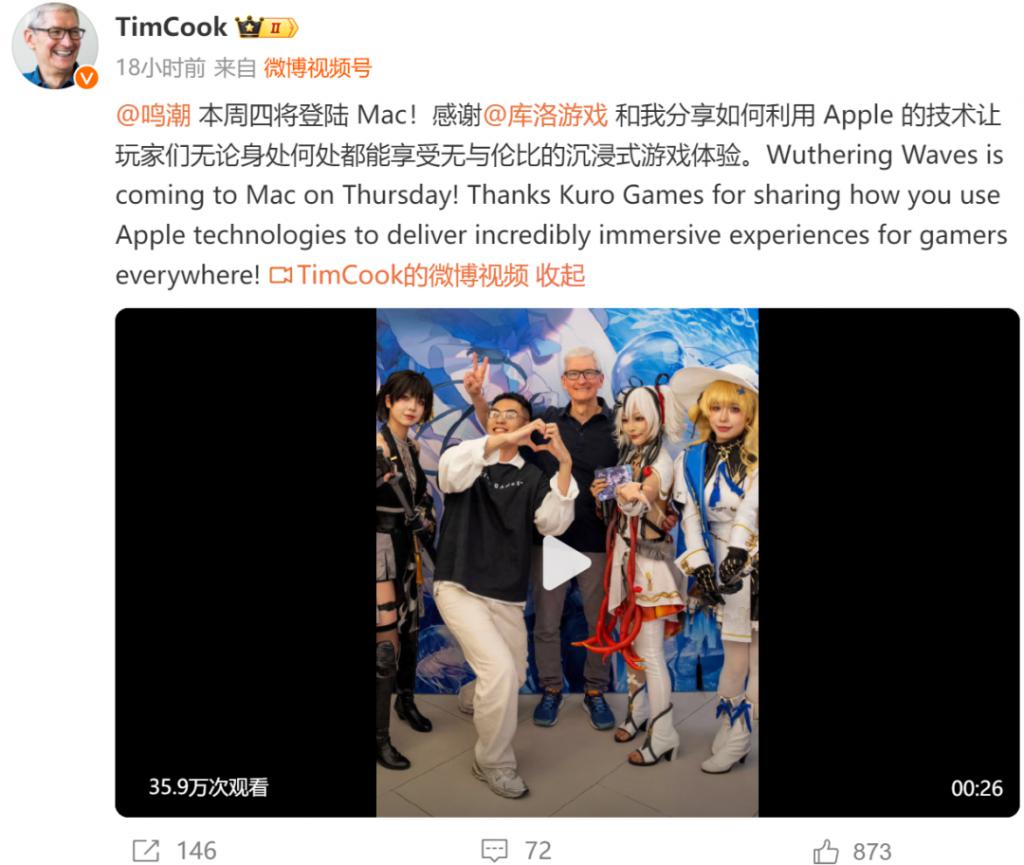 据库克最新微博显示,鸣潮将于本周四登录 Mac。
