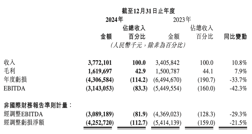 3月26日,人工智能软件公司商汤集团股份有限公司(商汤-W,0020.HK)公布2024年业绩。集团总体收入37.7亿元,同比增长10.8%;净亏损43.07亿元,同比收窄33.7%;毛利16.2亿元,毛利率42.9%。