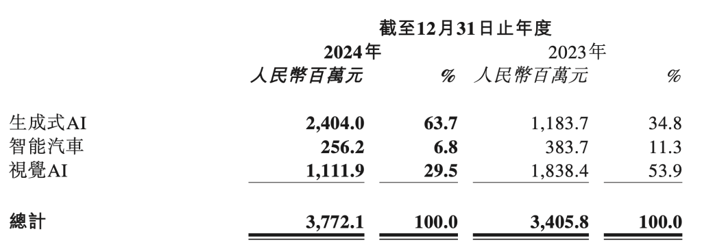 其中,生成式AI收入连续两年保持三位数增速,同比增长103.1%,突破24亿元,成为商汤最大业务。