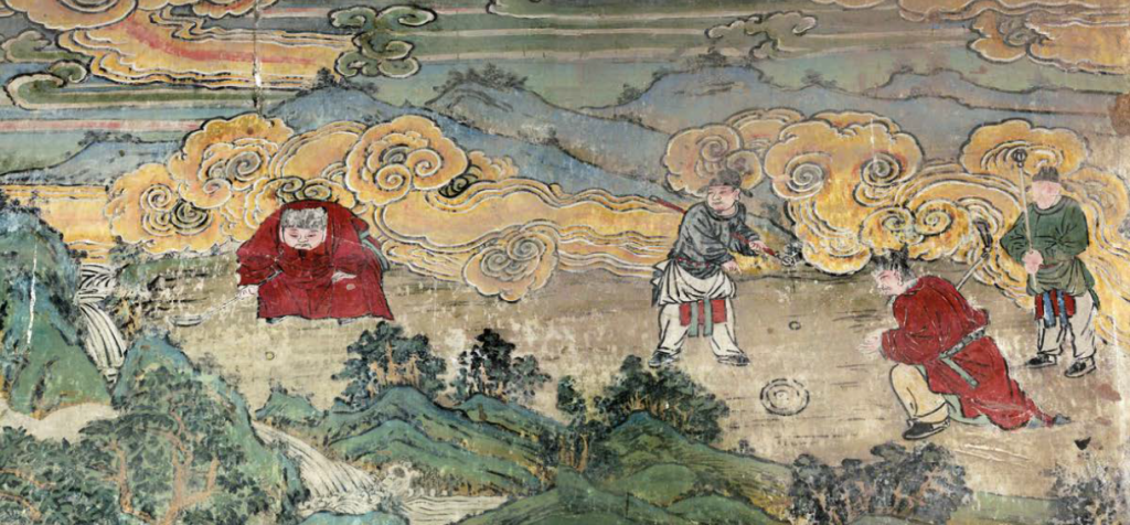 有趣的是,水神庙壁画不仅限于宗教主题,还包括描绘世俗生活的场景。例如,“捶丸图”描绘了一个类似打高尔夫球的动作,这引起了研究者的兴趣。最初提到这一点时,人们难以置信,认为是错误解读,但仔细观察后发现,画面中人物弯腰击球的姿态确实与现代高尔夫球动作相似,因此有人猜测这可能是古代的一种类似运动,甚至可能与唐代至宋代流行的马球有某种联系。虽然没有确凿证据表明它确实是高尔夫的前身,但在元代时期文化交流频繁的背景下,这种可能性并非完全不可想象。