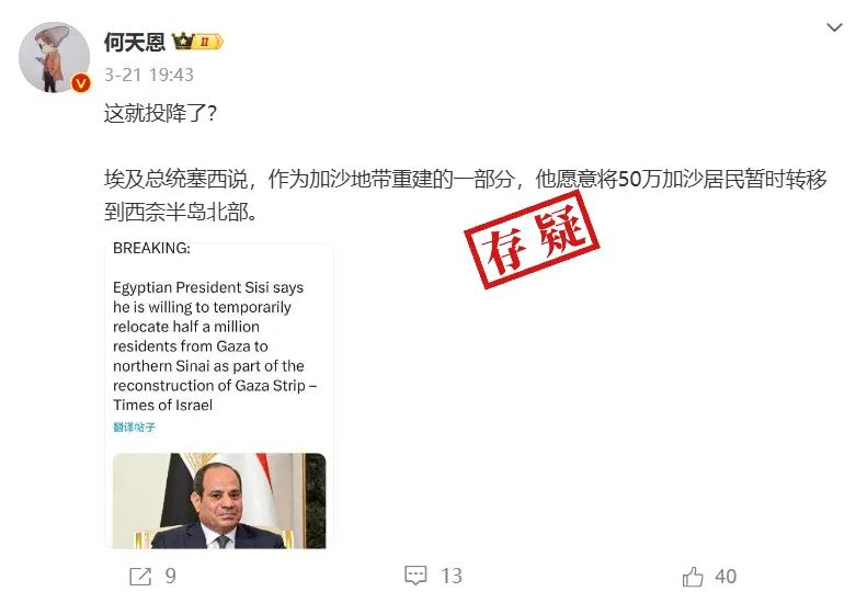 与此同时,社交平台上有说法称,“埃及总统愿意接受加沙人进入西奈半岛”。“埃及总统塞西说,作为加沙地带重建的一部分,他愿意将50万加沙居民暂时转移到西奈半岛北部。”