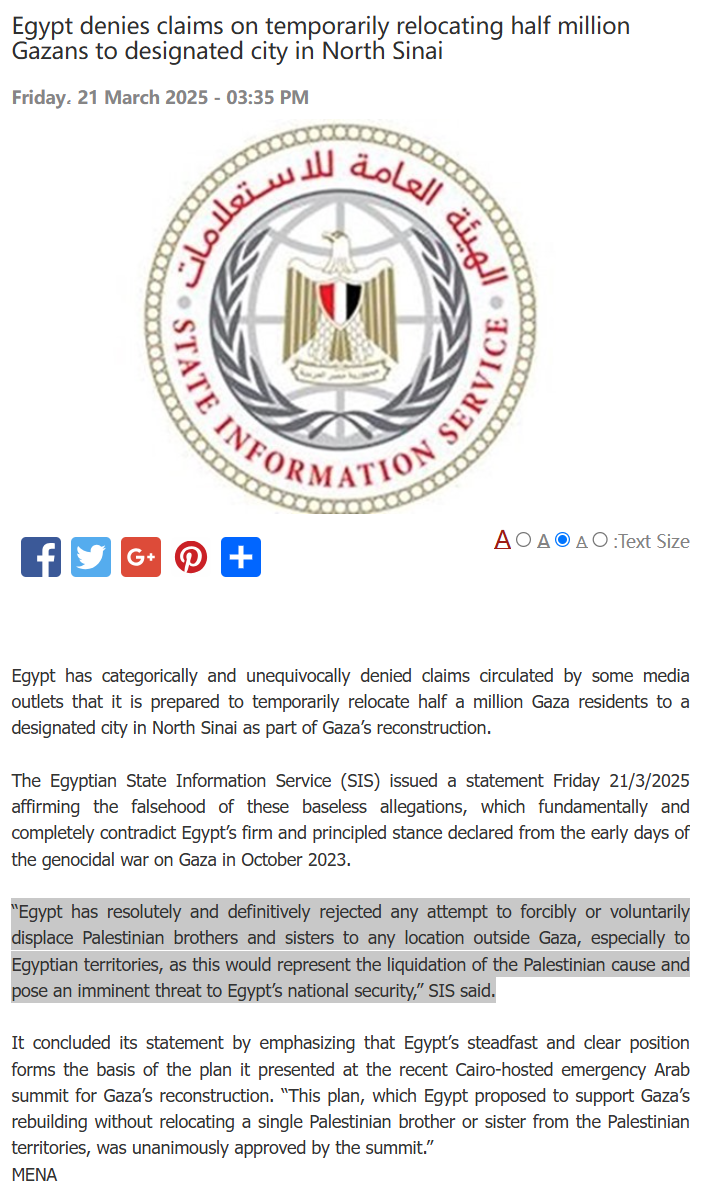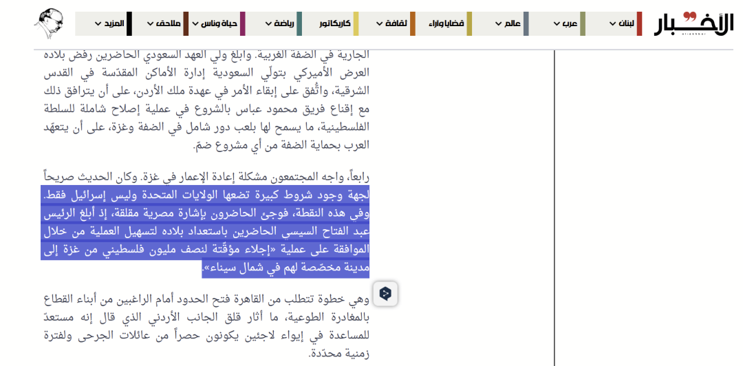 报道援引黎巴嫩媒体 Al-Akhbar在同一日发布的一篇文章称,“埃及总统阿卜杜勒·法塔赫·塞西已通知其他阿拉伯领导人,作为加沙地带重建工作的一部分,他愿意将加沙的50万居民暂时迁往西奈半岛北部的一个指定城市”。报道提到,Al-Akhbar发布的内容“没有得到任何其他消息来源的证实”。
