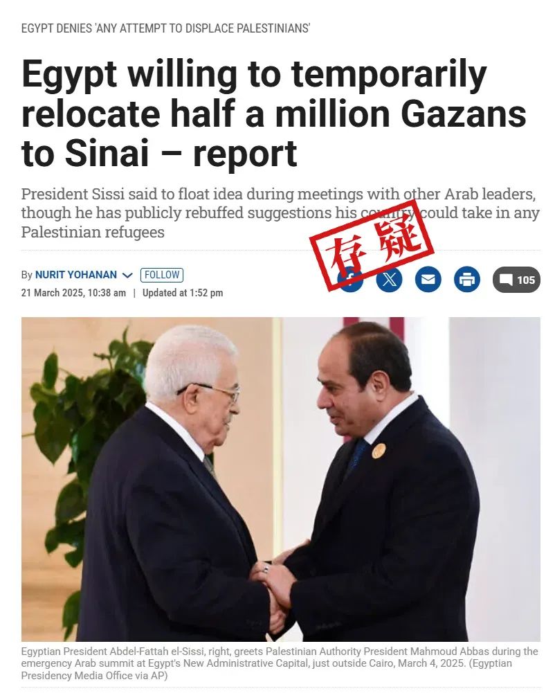 该文章称其从“一位参加两次地区发展会议的外交官”处了解到,“埃及总统阿卜杜勒·法塔赫·塞西告诉与会者他的国家愿意 ‘将五十万巴勒斯坦人从加沙暂时疏散到西奈北部指定城市’,来促进加沙重建的进程”。文章中没有提供具体的信源和其它相关证据。