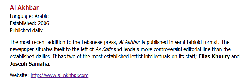 据“阿拉伯新闻网络”(Arab News Network)的存档记录,Al-Akhbar是一家成立于2006年的黎巴嫩左派媒体,具有半小报的性质。