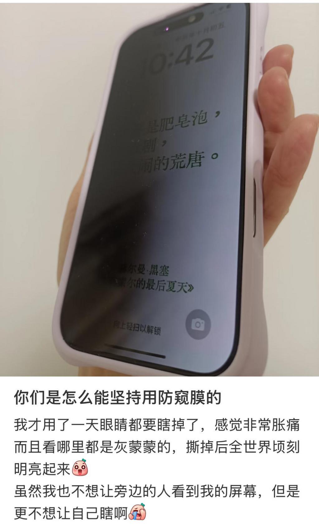 小杨说,为了看清楚屏幕她还把手机亮度调到最高,耗电量都增加了不少。" 不自觉就会把手机凑更近,眼睛要更用力聚焦。只用了一天我就受不了了,撕掉防窥膜感觉整个世界都干净了。"