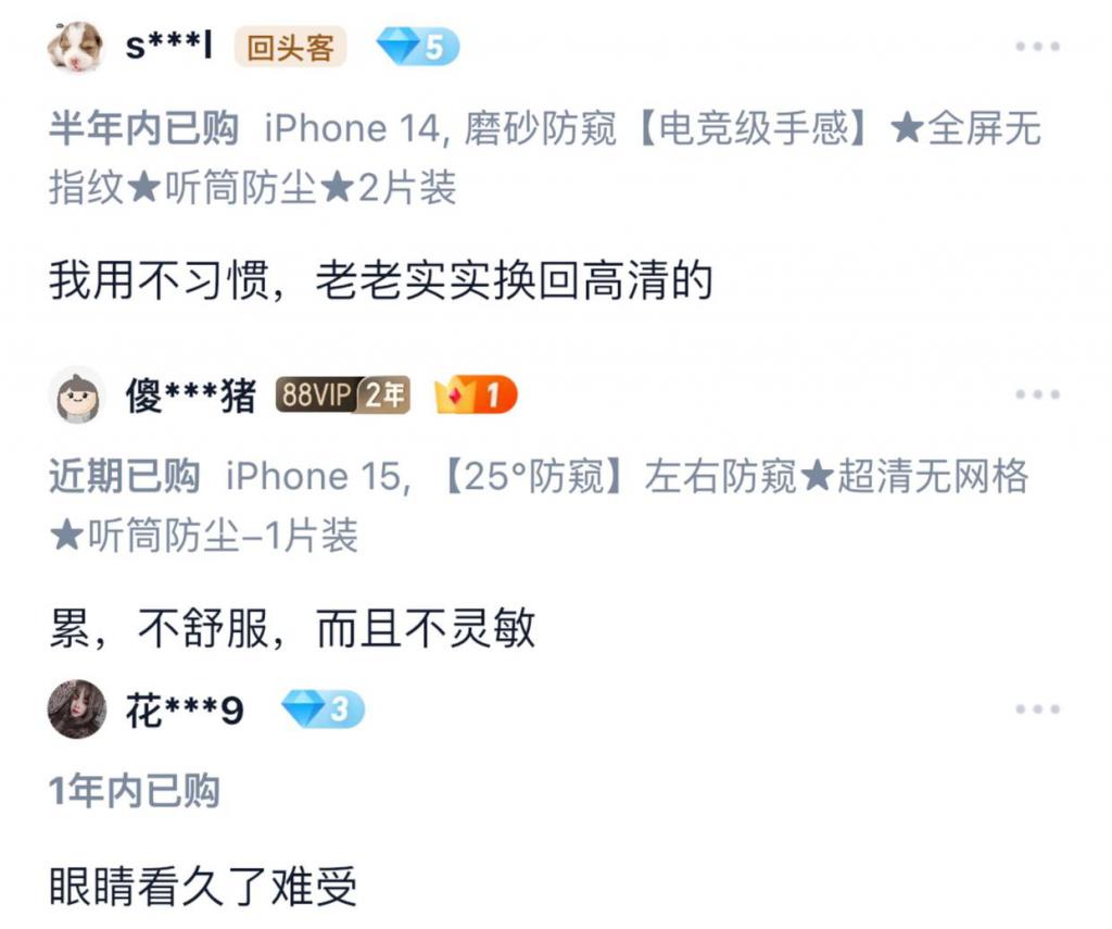 在某热销的防窥膜评论区有买家称:" 太伤眼了,看久了难受。"
