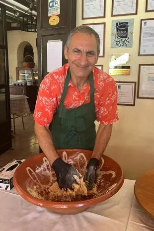 参观完克诺索斯后,我们在罗德岛停了下来,在那里,一家有40多年历史的家庭餐厅Hatzikelis taverna的可爱的Xara给我们上了一堂希腊烹饪的实践课。我们做了馅饼、炸章鱼饼、茄子沙拉、贻贝、大蒜和欧芹沙丁鱼、塞椒和酸黄瓜……然后吃了很多。