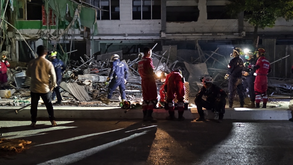 3月31日深夜,中国救援队在曼德勒一处发现生命迹象的公寓开展救援。本文图片均由 澎湃新闻记者 陈忠善 摄