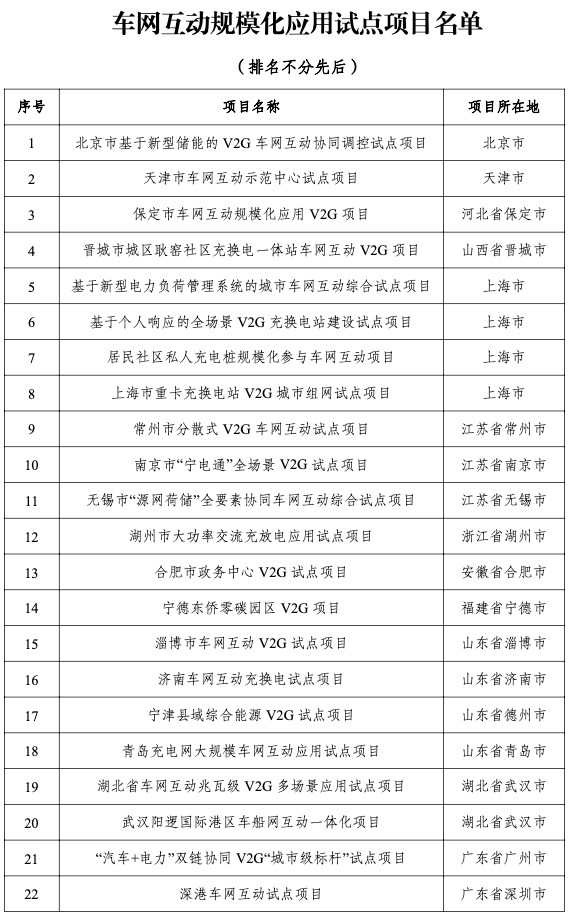 国家发展改革委办公厅、国家能源局综合司、工业和信息化部办公厅、市场监管总局办公厅发布通知,为支撑新型能源体系和新型电力系统构建,促进新能源汽车与电网融合互动,根据《关于加强新能源汽车与电网融合互动的实施意见》(发改能源〔2023〕1721号)、《关于推动车网互动规模化应用试点工作的通知》(发改办能源〔2024〕718号)等文件要求,国家发展改革委、国家能源局、工业和信息化部、市场监管总局联合组织开展了车网互动规模化应用试点申报及评审工作。现将首批车网互动规模化应用试点名单予以公布,并就有关事项通知如下。