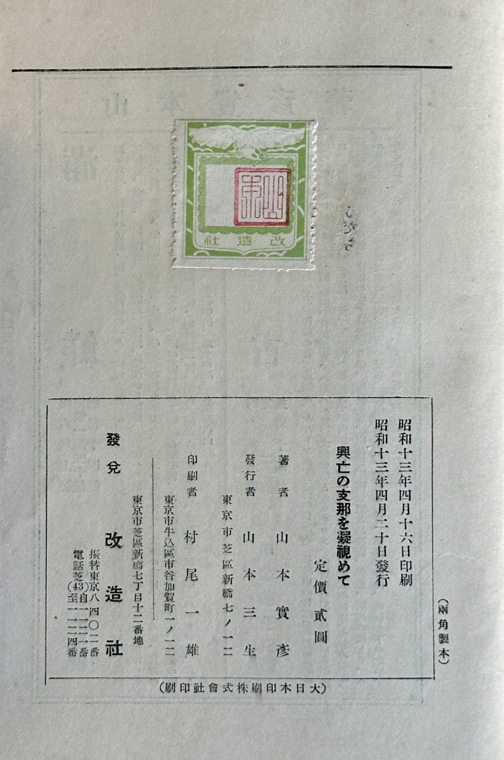 山本实彦生于1885年,卒于1952年。他是现代日本新闻出版业界的名人,无论是办杂志出书还是组织各种社会文化事业,都别出新裁引领潮流屡创纪录。他是日本九州鹿儿岛县人,从日本大学法学系毕业后,进入报社做记者。1919年,他设立改造社,创办《改造》月刊,没用几年便将《改造》培育成了与老牌的《中央公论》并驾齐驱的知名刊物。在书籍出版经营上也敏感于时代脉动,大胆尝试编辑出版改革,开创出“元本时代”的好景气,成为出版界的翘楚。山本其人颇有左翼色彩,对中国社会有浓厚兴趣,经常来华踏访考察,致力了解和研究中国,与中国各界有很多交流互动,可谓是中国通。他出版有系列中国见闻记,包括《满洲及朝鲜》(改造社,1932年)、《中国》(改造社,1936年)、《中华事变 北支篇》(改造社,1937年)、《大陆纵断》(改造社,1937年)、《凝视兴亡之际的中国》(改造社,1938年),以及《激荡的中国》(改造社,1939年)等。值得一提的是,即使在中日关系恶化并进入战争状态之后,山本还在其主持的《改造》杂志上展开中日文学者的对话交流,译介中国左翼文学作品,甚至还在1938年10月号和11月号上刊载毛泽东的名作《论持久战》(「持久戦を論ず」)、《抗日游击战争的战略问题》(「抗日游撃戦論」)。