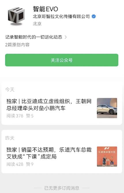 首页 > 资讯 比亚迪法务部:向自媒体“智能EVO”发起诉讼 ZAKER 科技 4 月 4 日消息,比亚迪法务部官方微博 4 月 3 日晚发文称,将向自媒体 " 智能 EVO" 发起诉讼此前,自媒体博主 " 智能 EVO" 在网上发布文章《独家|比亚迪成立虚线组织,王朝网总经理牵头对垒小鹏汽车》引发网友关注。据天眼查显示,自媒体博主 " 智能 EVO" 的公司北京哥智拉文化传播有限公司于 2025 年 3 月 4 日成立,公众号内仅发布了两篇文章。