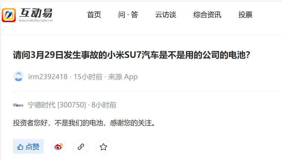 4 月 2 日消息,有投资者在互动平台向宁德时代提问,3 月 29 日发生事故的小米 SU7 汽车是不是用的宁德时代的电池?对此,宁德时代予以否认:" 不是我们的电池。"
