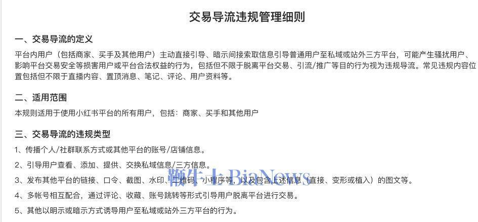 今年 3 月份小红书电商发布的《交易导流违规管理细则》,明确禁止内容创作者通过除小红书商城、直播间内购物车功能、官方留资组件之外的其他任何形式引导站外交易,违规将面临警告、限制直播甚至永久封号等处罚。
