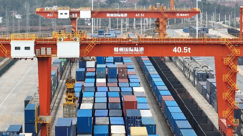 江西赣州国际陆港货场货车往来作业。 视觉中国 图