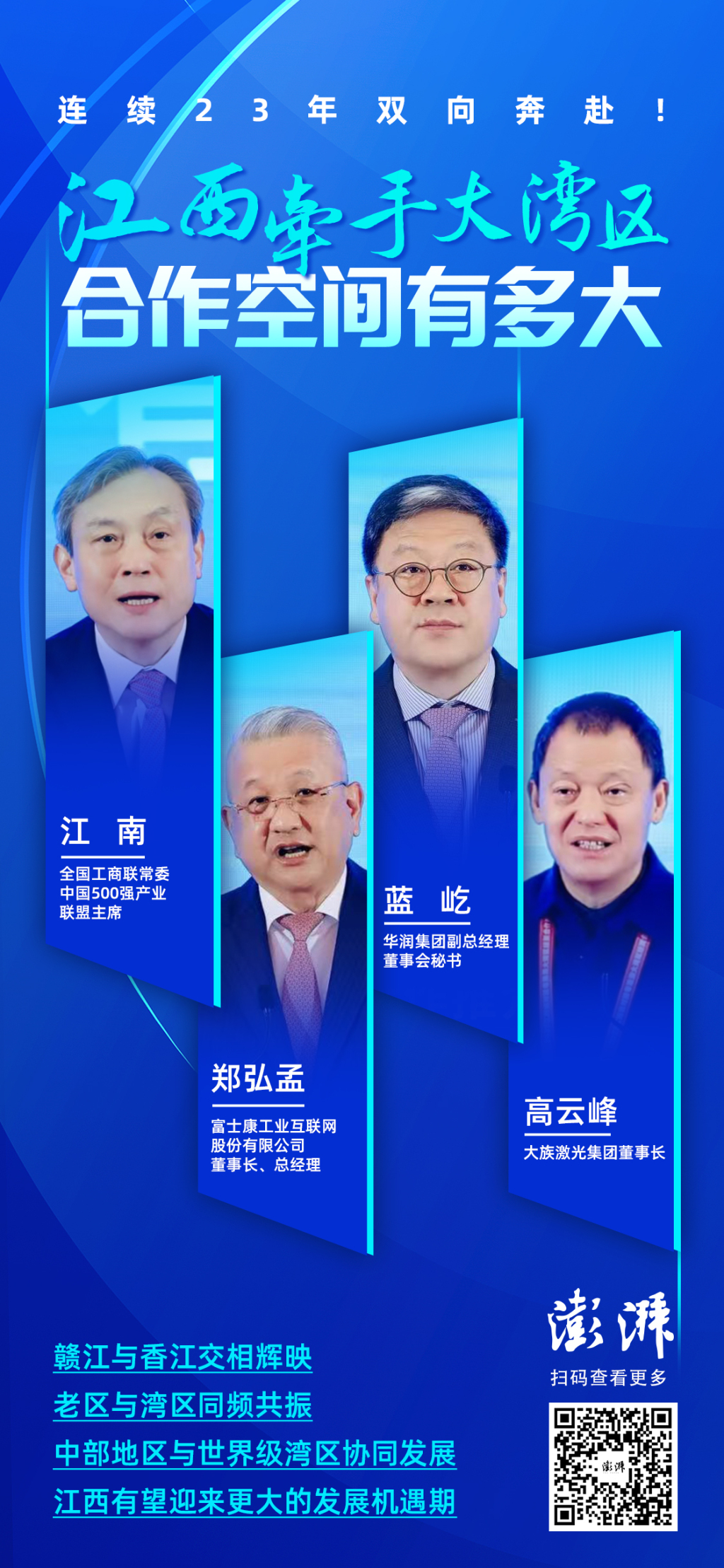 且不说江西不仅是大湾区绿色食品、淡水和旅游休闲供应的“后花园”,也是大湾区产业发展的重要人口蓄水池。根据第七次全国人口普查统计公报,在广东2900多万外来务工人员中,来自江西的多达230万,而赣商企业更超过了5万家。