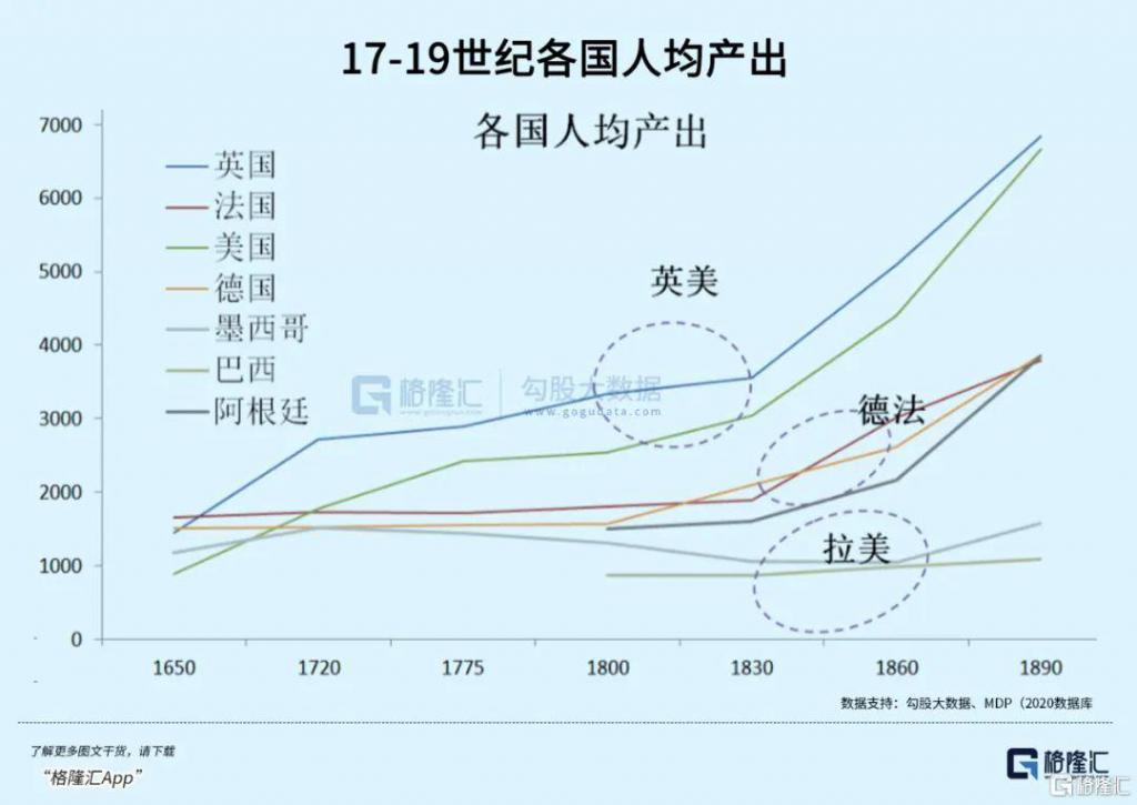 根据 Maddison Project Database 的经济史数据,看下图。早从 1720 年开始,13 块殖民地的人均产出就超越德法,仅次于英国本土。