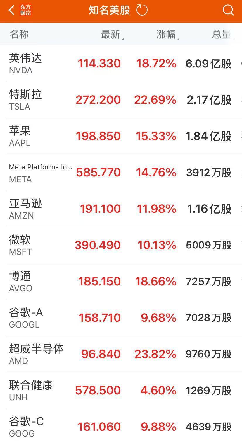 大型科技股大幅走高,特斯拉涨超 22%,英伟达涨超 18%,苹果涨超 15%,谷歌涨超 9% 垫底 " 七巨头 "。