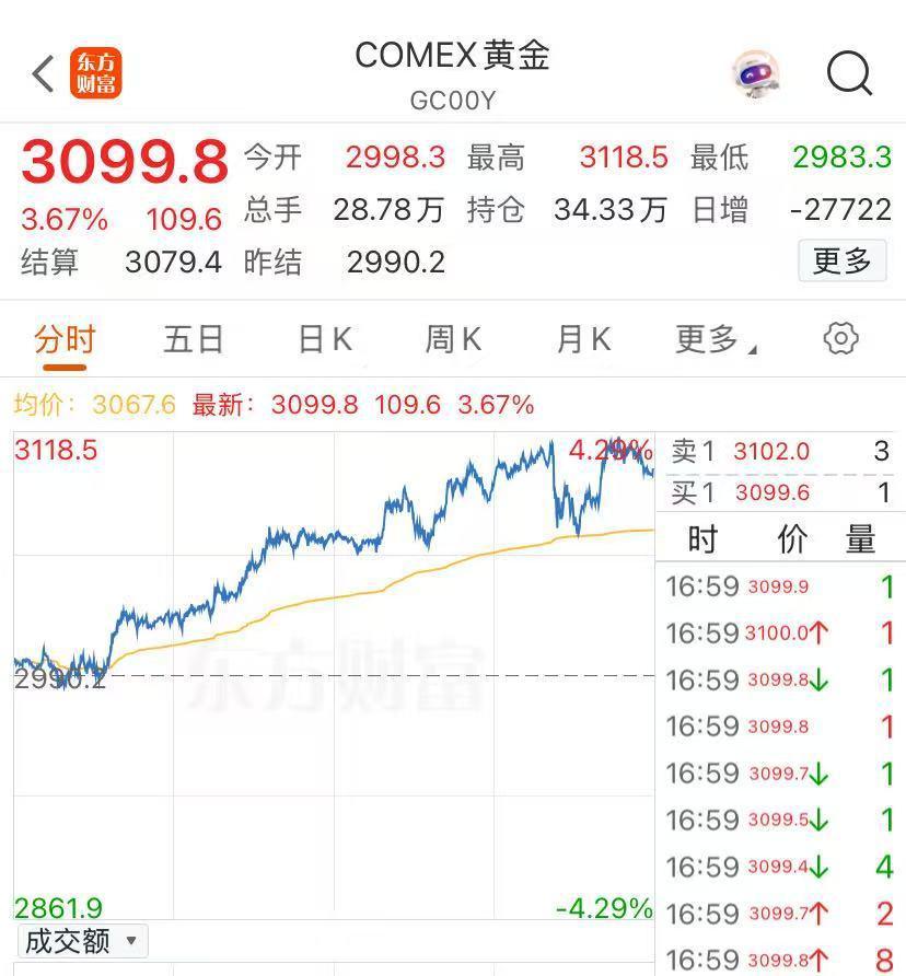 COMEX 黄金大涨 3.67%,报收 3099.8 美元 / 盎司。