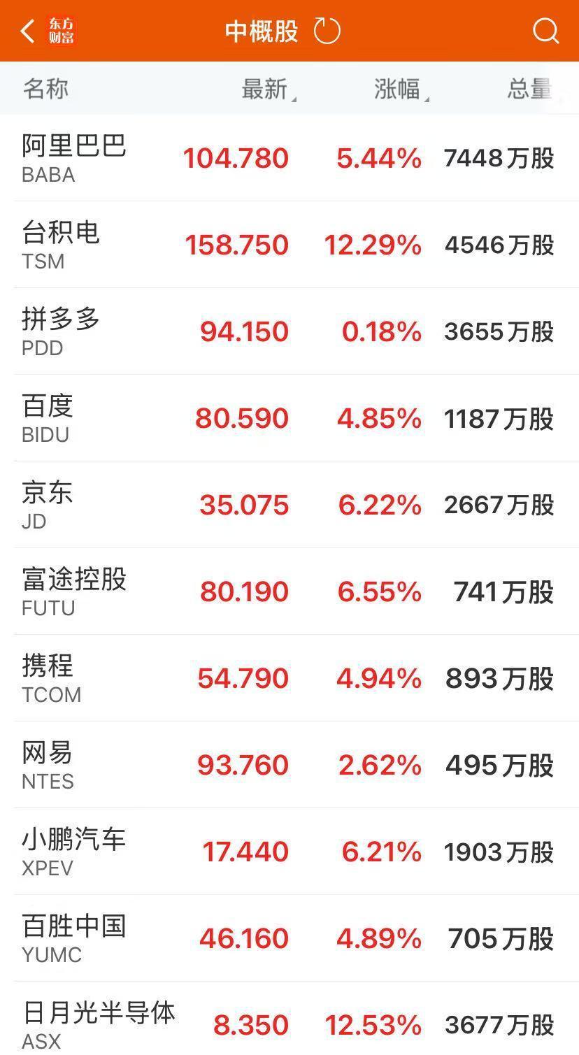 理想汽车涨 6.82%,京东涨 6.22%,小鹏汽车涨 6.21%,腾讯音乐涨 5.51%,阿里巴巴涨 5.44%,蔚来涨 5.41%,百度涨 4.85%,新东方涨 4.15%,拼多多涨 0.18%,好未来跌 1.33%。