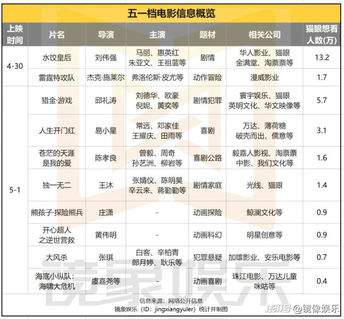眼下,五一档影片已经陆续启动了更为密集的映前宣发,我们期待稳中求进的五一档,能够在影市拉出新一轮的票房高潮。