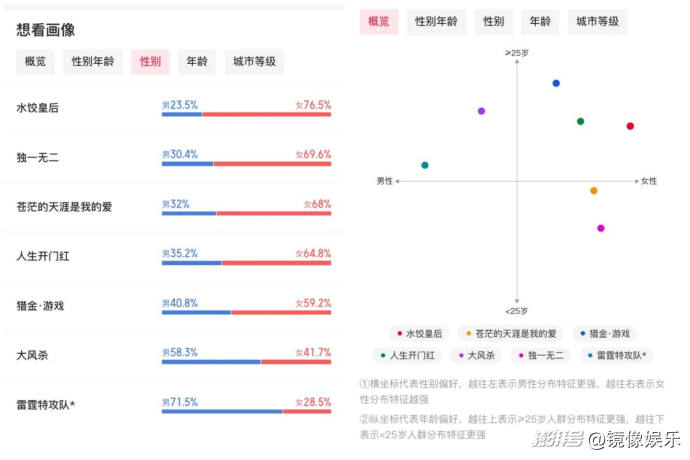 猫眼专业版数据显示,五一档的真人电影中,虽然多数影片仍然延续了女性受众为主的大盘整体走势,但悬疑片《大风杀》、漫威电影《雷霆特攻队》,都呈现出了更为明显的男性向,男性想看人群占比分别达到58.3%和71.5%。而在年龄分布上,影片对应受众的差异化也比较明显。比如同为女性向的《水饺皇后》和治愈家庭片《独一无二》,前者25岁以上的女性观众占比接近50%,而后者则多为25岁以下的女性受众,占比为41.8%。