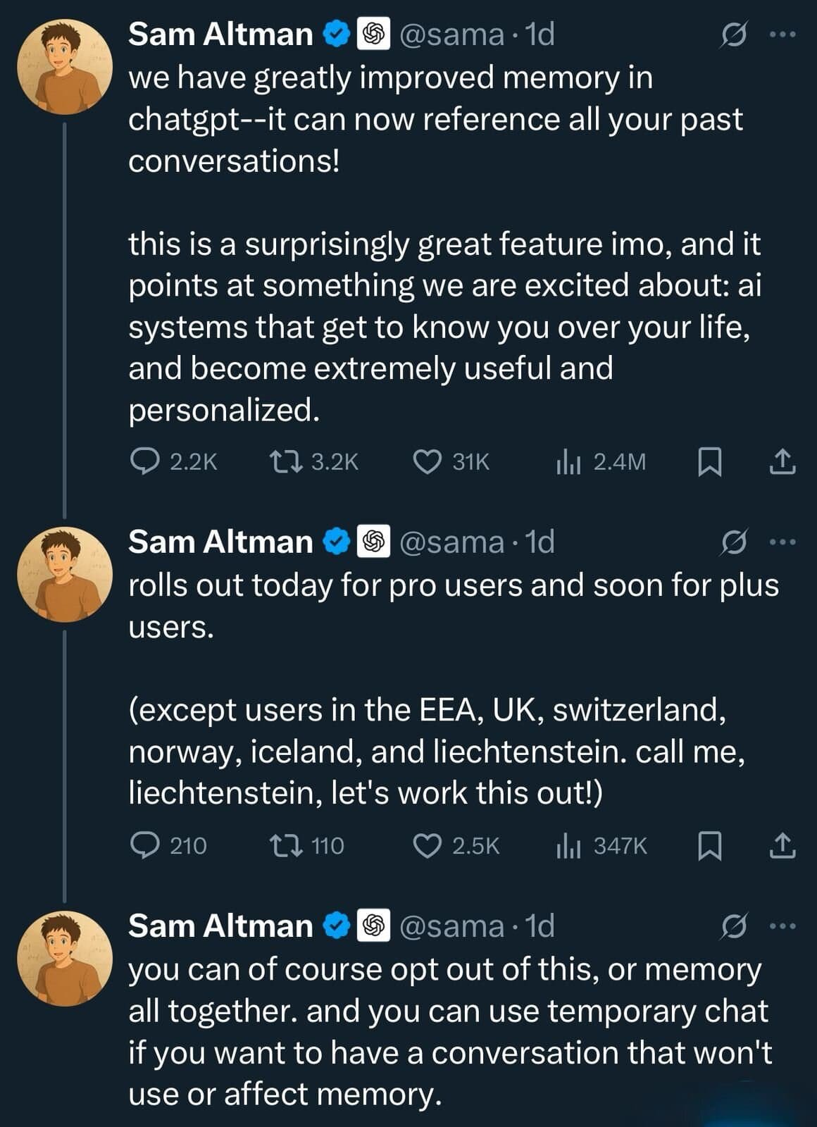 OpenAI首席执行官萨姆·奥特曼在帖子中写道:“这是一个非常棒的功能。”他表示,这反映了人工智能将变得“非常有用和个性化”的未来。