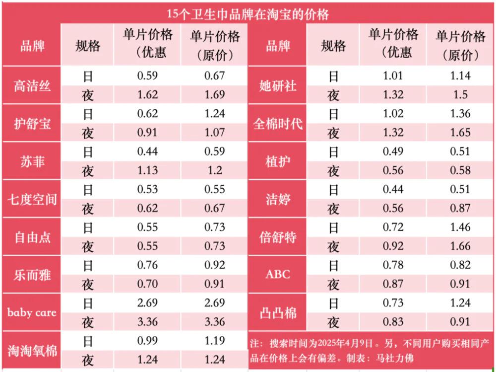 打折促销进一步放大了价格差异。不同平台的优惠策略五花八门,满减叠加、会员专属券、限时秒杀等手段让同款产品在不同渠道的到手价相差悬殊,有的卫生巾单片促销价较日常售价低 0.7 元。