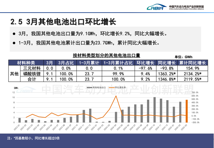 值得注意的是,一季度其他电池的出口量为23.7 GWh,累计同比增长2119.5%,其中99.9%为磷酸铁锂电池。